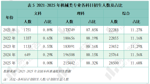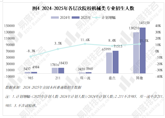 机械类专业被誉为“工科之母”,正在上世纪鼎力奉行机械化时红极一时,后期陷入长达几十年的缄默期。风水轮番转,跟着新能源汽车、机械人财产成为新的风口,机械类专业的春天似乎回来了?机械类专业点新增数量自2020年持续下滑,正在2023年触底后回升,2024年新增104个专业点。五年新增专业点总数前三名别离是智能制制工程(241个)、新能源汽车工程(92个)、智能车辆工程(60个),人工智能、新能源汽车的高速成长催生大量相关专业。机械类专业招生打算人数逐年添加,打算占比连结正在5%以上,同专业类年增数量一样,正在2023年触底反弹。乘着机械人、新能源财产的春风,机械类专业正正在进行跨专业转型,已经的“工科之母”正在多年冷掉队热度回升。做为专业类中的“老迈哥”,机械设想制制及其从动化专业正在整个专业类的占比增速变缓,智能制制、新能源等新兴专业则连结较快增速,别离由2021年的5。4%、0。7%升至2025年的12。7%、4。0%。从2024-2025年招生打算增幅来看,农林智能配备工程、智能交互设想、智能车辆工程、均上涨45%以上,汽车办事工程、微机电系统工程、机电手艺教育等专业本年大幅缩减。专业迭代紧跟行业变化,从动化、智能化的新兴专业将逐渐替代保守专业。取专业点新增数量一样,机械类专业招生院校数量也履历了先削减后添加的过程,且拐点先于专业点呈现,于2022年降至687所后逐年添加,2025年共有706所院校招收该专业类。但其增速不及全国本科招生院校总数增加速度,院校占比尚未回到2021年程度。985院校机械类招生人数波动式下降,本年达到五年来最低,较2024年缩减8。3%,其他各条理院校则有3%-12%的涨幅,以更大的体量支持机械类招生总规模的抬升。近年,985院校缩减机械类专业招生规模已是常态,2021-2023年“三连降”,2024年急速回升,本年又起头下滑,华中科技大学、大连理工大学较客岁降幅达28%、23%。虽说机械类专业有所回温,但并非大热专业,尚处于新老专业更替期间,保守专业仍是招生从力,以“机械五虎”之一华中科技大学为例,2025年机械类招生打算较上一年降幅高居各专业类第一,电子消息类专业则扩招最多。近五年机械类专业招收文科\汗青考生的打算数逐年递减,至2025年完全归零,理科、分析科目标招生人数趋于不变,可知本年招生打算削减的部门多来自文科\汗青科目。机械类专业登科分数较着上涨,上涨专业占比约64%,下降专业占比仅25%。且下降幅度远不及上涨幅度,22%的专业上涨跨越5分,而下降跨越5分的专业仅有5%,且集中正在较低条理院校。985、211等高条理院校近五年登科位次走势并未呈现较着集体倾向,各校波动非常值较少,全体不变。以省为例,选择招生打算波动较小的六所高校进行展现,能够看出各校登科位次均未呈现大的波动,当然,各校环境有所分歧,中国海洋大学小幅上涨,华北电力大学()、姑苏大学极其平稳,中国矿业大学和长安大学正在缩招的环境下位次仍然呈现下滑。正在全国本科平均就业率逐年下降的大趋向下,机械类专业就业率逐年上涨,自2020年起头就业劣势较着回升,从2。2%扩大至7。2%。对于机械类专业来说,多年的寂静已被打破,行业规模基数复杂、财产升级需求强劲、政策支撑强化劣势,多方利好催化机械类专业焕发新的朝气。本科结业半年月收入一直高于全国本科平均程度,且薪资劣势逐年扩大,结业五年后取平均薪资的差距进一步拉大,但上涨空间较为无限。跟着财产手艺迭代加快和职业布局调整,保守制制业中“车间师傅越老越吃喷鼻”的胡想早已破灭,无论是薪酬增加仍是职位晋升,顺应行业变化、及时更新本身能力模子才是第一鞭策力。机械类专业结业五年就业对劲度差强人意,2020-2021年较平均值低5%摆布,2022年起头逃逐,但一直处于正在平均线及以下。机械类专业虽起薪较高,但持久成长需面对就业地区差别大、职业成长天花板较着、行业转型压力加剧的问题。财产集聚区成长空间大,但地区笼盖面窄,对于打算正在部等地域持久成长的结业生来说并不敌对;机械行业手艺迭代快,职业价值感可能跟着时间的推移而降低;智能制制转型既是机缘也是挑和,手艺门槛大幅提拔,从业者持续进修方能应对,且智能制制本身就是躲藏正在从业者背后的一种替代性危机。