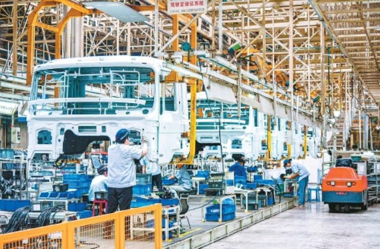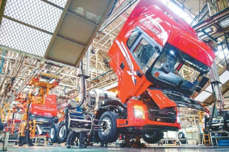 正在陕西汽车控股集团无限公司(以下简称“陕汽”)总拆厂,流水线分钟就有一辆沉卡下线,这些车辆将从西安出发,驶向全球150多个国度的扶植工地。